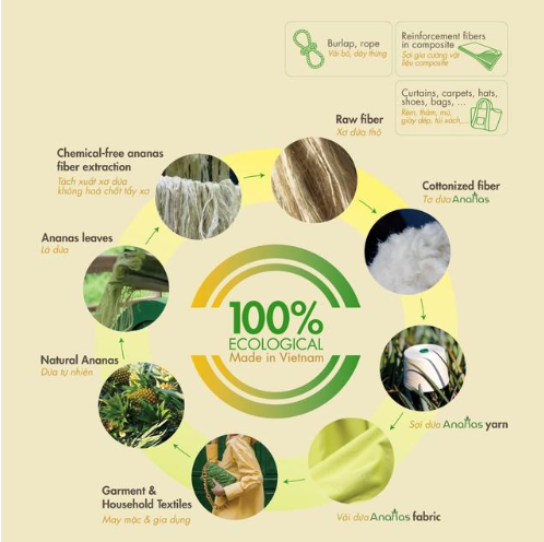 Như vậy, thị trường sợi vải eco made-in-Vietnam bảo đảm chuỗi cung ứng nguyên liệu dệt may minh bạch nguồn gốc Việt (originated-in-Vietnam), từ thu hoạch lá dứa, tách xuất xơ thô, đến sản xuất tơ, cung cấp sợi, phân phối vải dệt thành phẩm…